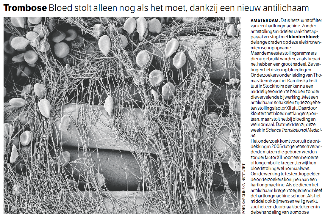The second article from the same edition of the NRC is related to the topic of my thesis. It is about the role of FXII in thrombosis, based on a publication by Thomas Renne et al in Science translational medicine. Antibodies against FXII downregulate the pathological thrombogenenis during extracorporeal circulation. These antibodies might be used in the prevention of clots during heart-lung surgery, but might also be applied in the prevention of thrombosis, both arterial and venous. Click here (pdf) for the NRC newspaper article, and here for the original research by Renne et al.
